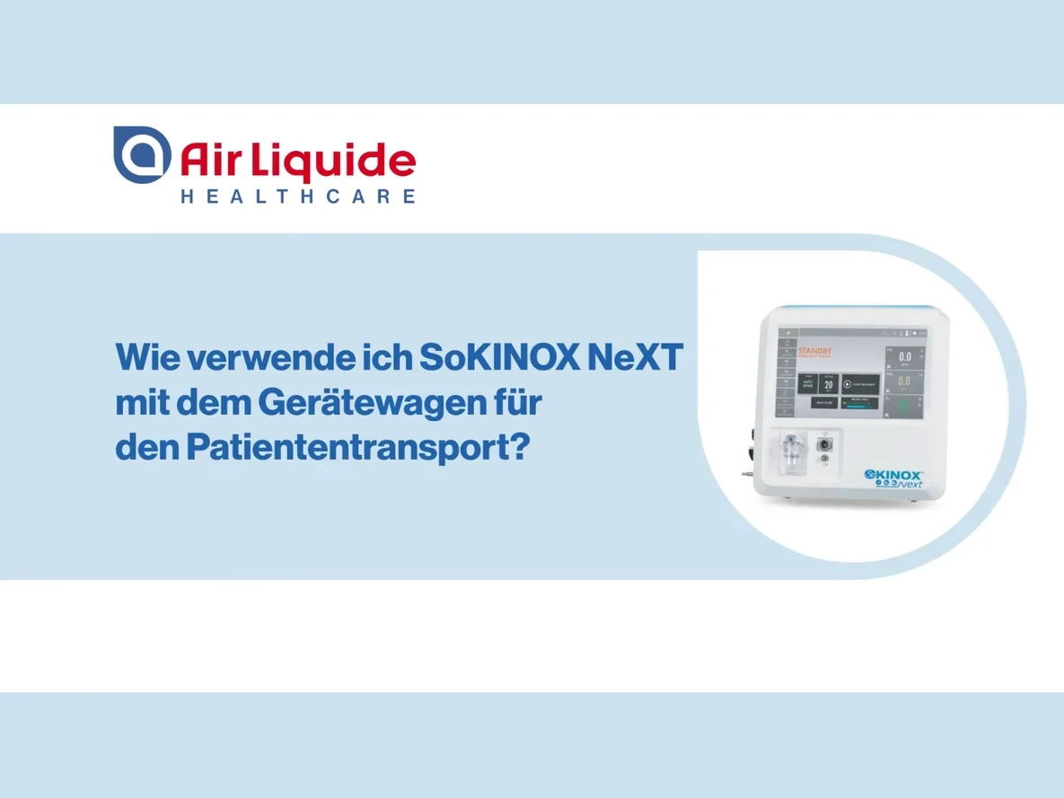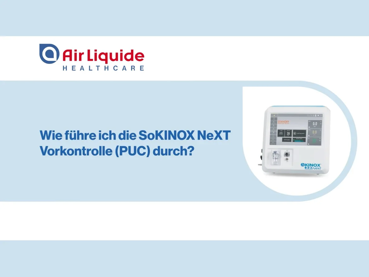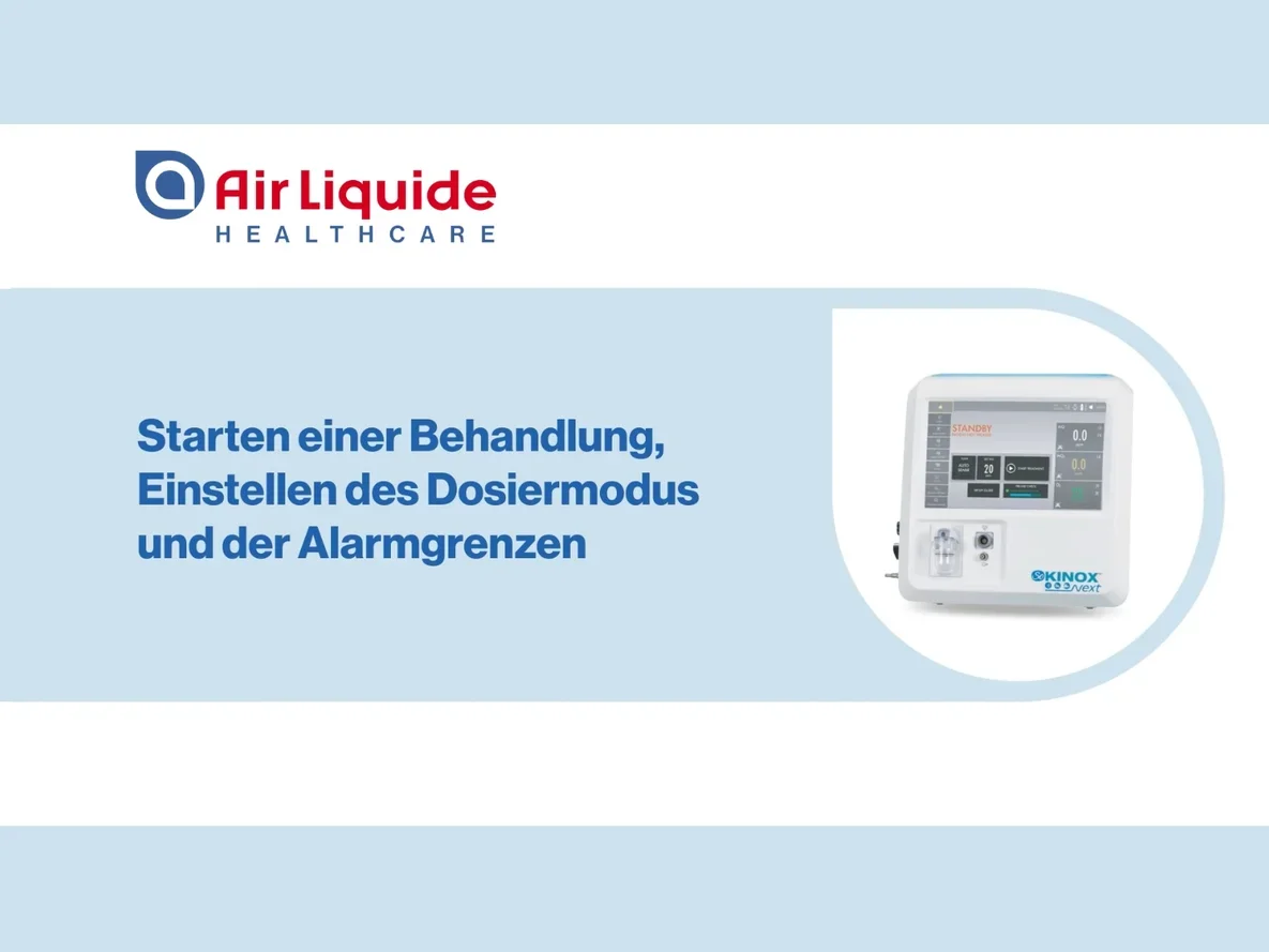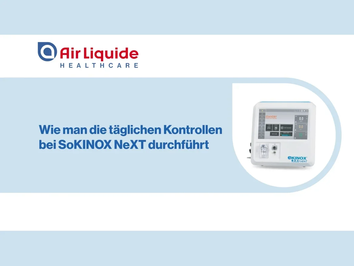 Diese Video-Tutorials sind zur Unterstützung von medizinischem Fachpersonal gedacht, das bereits auf SoKINOX™ NeXT geschult wurde. Sie sind kein Ersatz für das Benutzerhandbuch oder das Schulungsprogramm. Alle Rechte sind Air Liquide Healthcare vorbehalten. Die kommerzielle Nutzung durch Dritte ist nicht gestattet. Das SoKINOX™ NeXT Verabreichungs- und Überwachungssystem ist ein Medizinprodukt der Klasse IIb, hergestellt von INOsystems (Notified Body CE0123). Der bestimmungsgemäße Gebrauch dieses Geräts ist die Verabreichung von ärztlich verordnetem Stickstoffmonoxid (NO) zur Behandlung von Erwachsenen, Neugeborenen und Kindern. Es überwacht zudem inspiratorisch die Gase NO, NO₂ und O₂. Details zur Anwendung und Indikation des medizinischen NO-Gases entnehmen Sie bitte der Fachinformation des Arzneimittel.