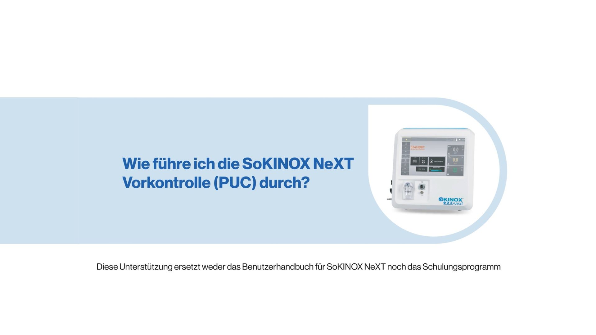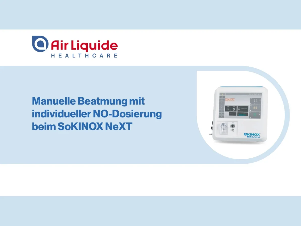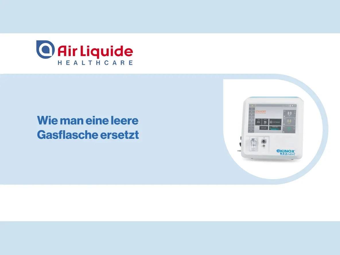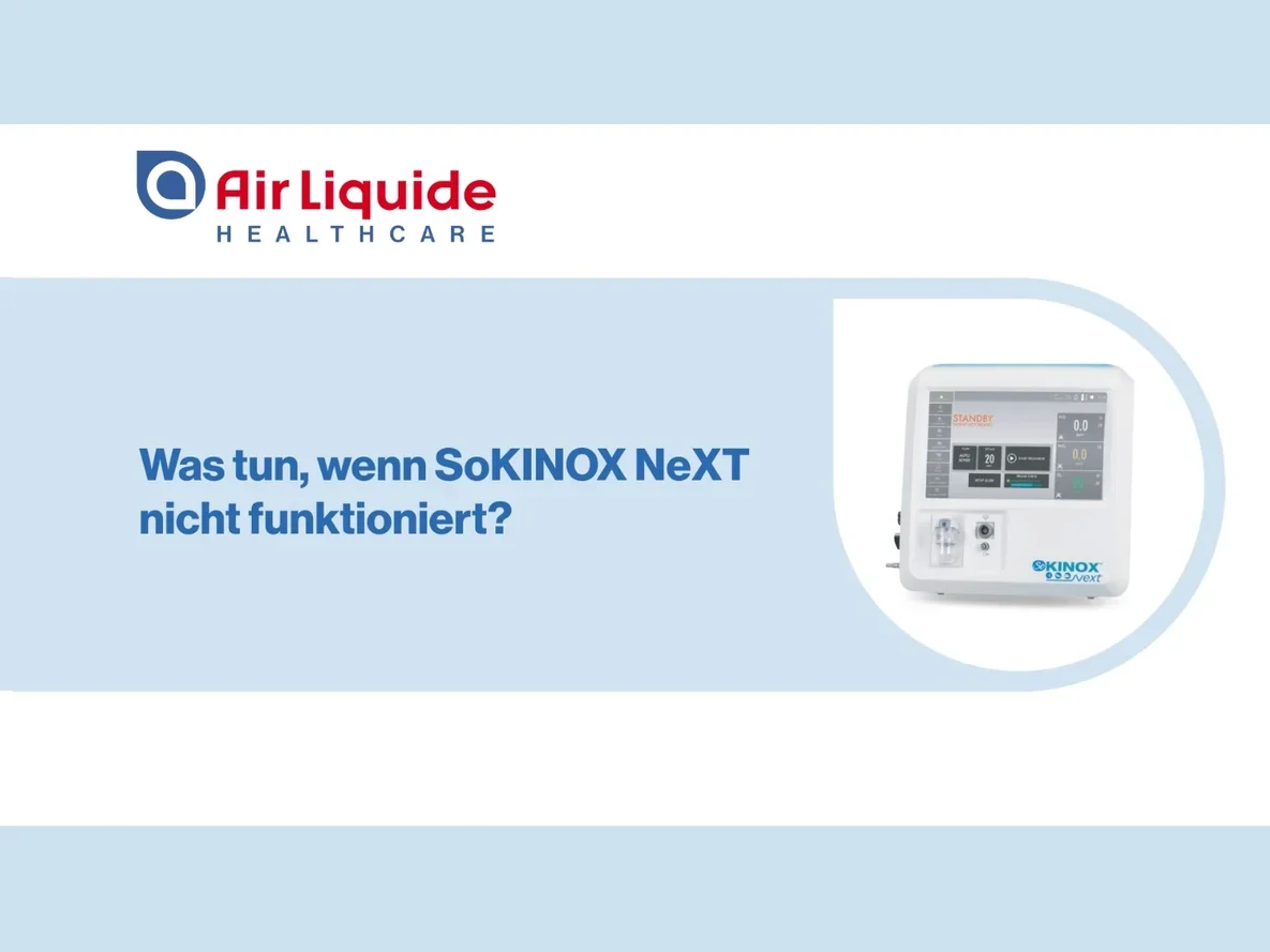 Diese Video-Tutorials sind zur Unterstützung von medizinischem Fachpersonal gedacht, das bereits auf SoKINOX™ NeXT geschult wurde. Sie sind kein Ersatz für das Benutzerhandbuch oder das Schulungsprogramm. Alle Rechte sind Air Liquide Healthcare vorbehalten. Die kommerzielle Nutzung durch Dritte ist nicht gestattet. Das SoKINOX™ NeXT Verabreichungs- und Überwachungssystem ist ein Medizinprodukt der Klasse IIb, hergestellt von INOsystems (Notified Body CE0123). Der bestimmungsgemäße Gebrauch dieses Geräts ist die Verabreichung von ärztlich verordnetem Stickstoffmonoxid (NO) zur Behandlung von Erwachsenen, Neugeborenen und Kindern. Es überwacht zudem inspiratorisch die Gase NO, NO₂ und O₂. Details zur Anwendung und Indikation des medizinischen NO-Gases entnehmen Sie bitte der Fachinformation des Arzneimittel.